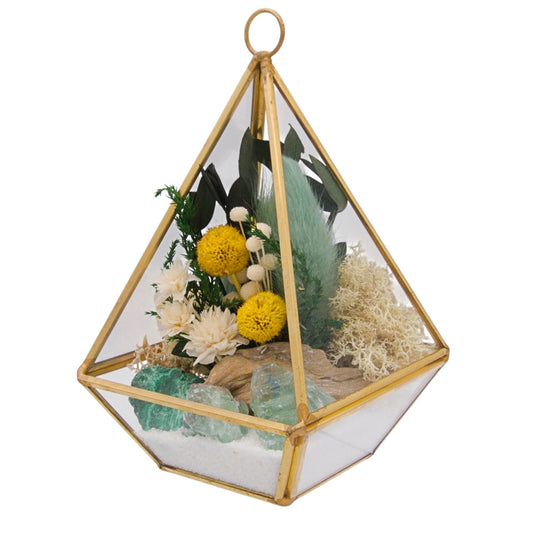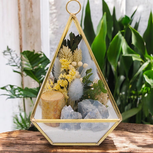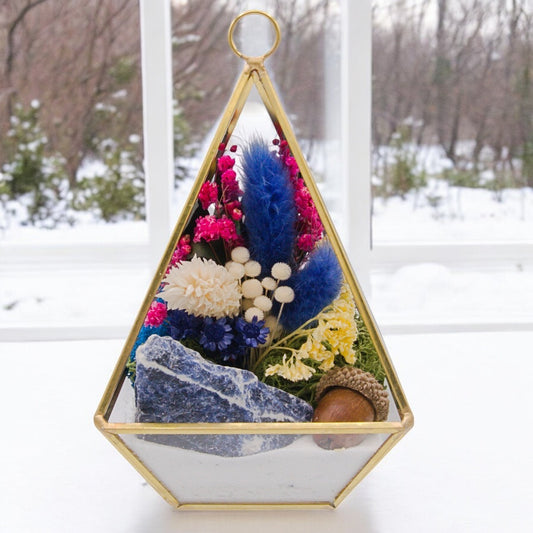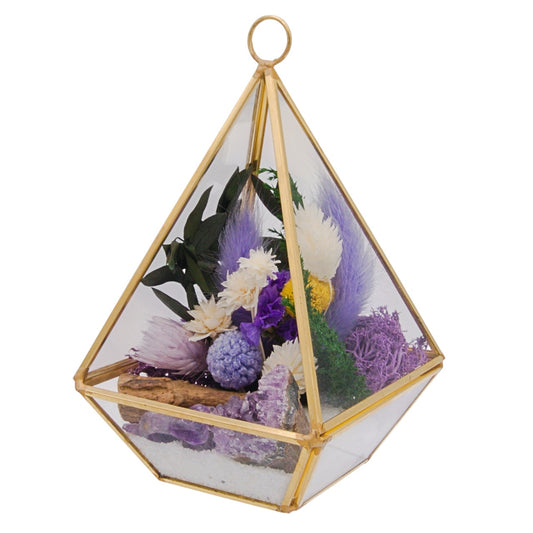 Our Victorian greenhouse-style terrariums combine the elegance of a geometric glass terrarium with a modern touch of nature. Each terrarium includes a bouquet of dried flowers, moss, and crystals. Some arrangements feature airplants, while others do not. These simple yet charming pieces add a unique, vintage feel to your space.