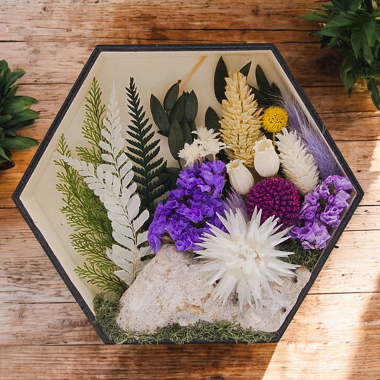 Découvrez la beauté de la nature avec nos paysages d'art vivant. Fabriqués à la main avec soin, ces cadres captivants présentent une fusion de fleurs séchées, de mousse luxuriante, de champignons préservés et de fougères - tous soigneusement disposés dans une variété de formes et de tailles de cadres. Certaines pièces comprennent des plantes aériennes, d'autres non, pour un entretien encore plus facile. Rehaussez votre espace avec ces chefs-d'œuvre vivants et apportez la tranquillité de l'extérieur à l'intérieur.