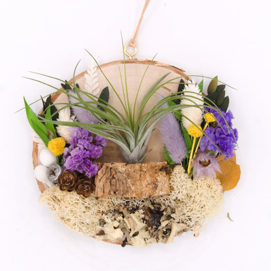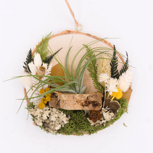 Découvrez notre collection d'ornements de plantes aériennes délicatement montés sur des plaques de bois de bouleau ornées d'un mélange de fleurs séchées et de mousse. Chaque pièce est ornée d'une plante aérienne vivante, ajoutant une touche d'élégance naturelle à n'importe quel espace.