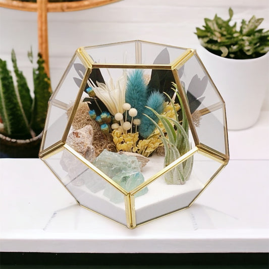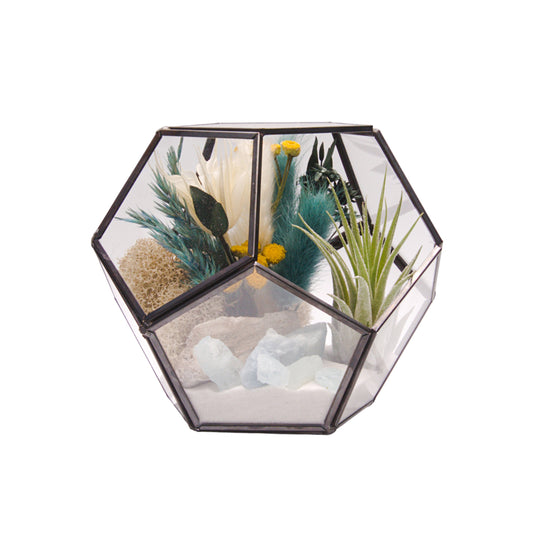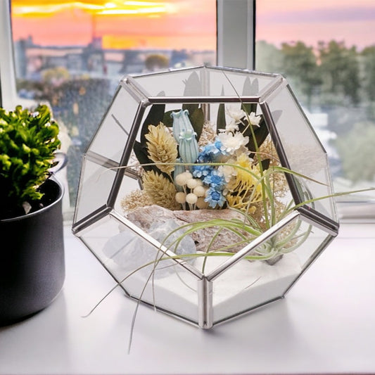 Terrarium Victorian à bol avec une plante aérienne et des cristaux d'aigue-marine