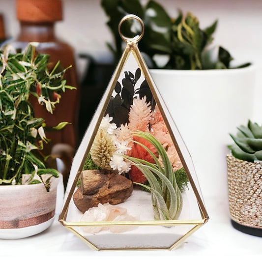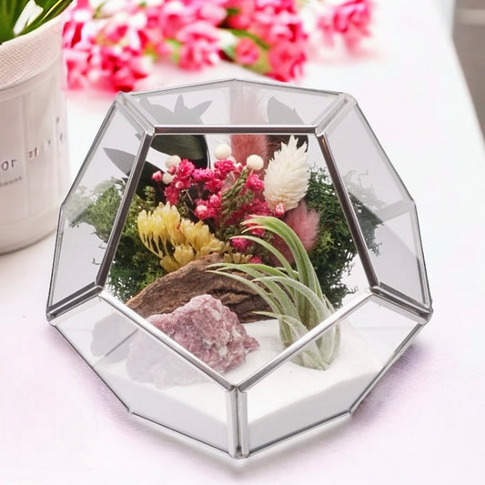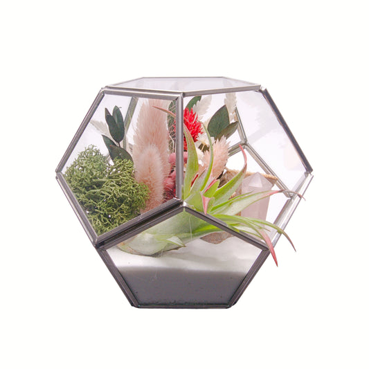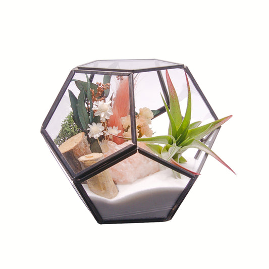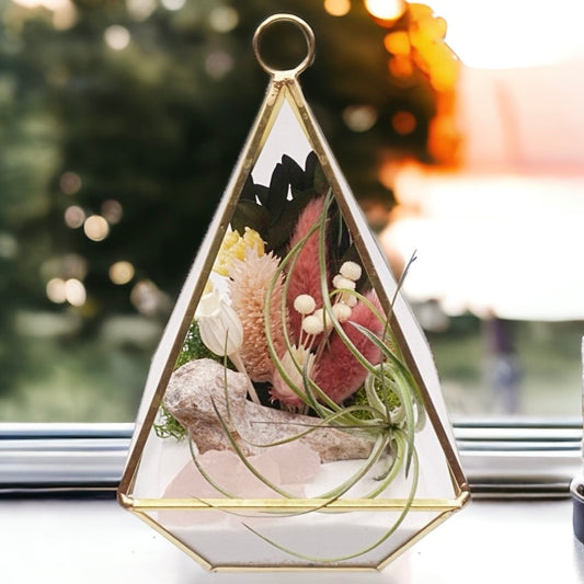 Terrarium Victorian à bol avec une plante aérienne et cristal quartz rose