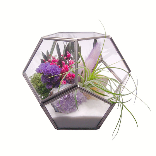 Terrarium Victorian à bol avec une plante aérienne et des cristaux d'améthystes