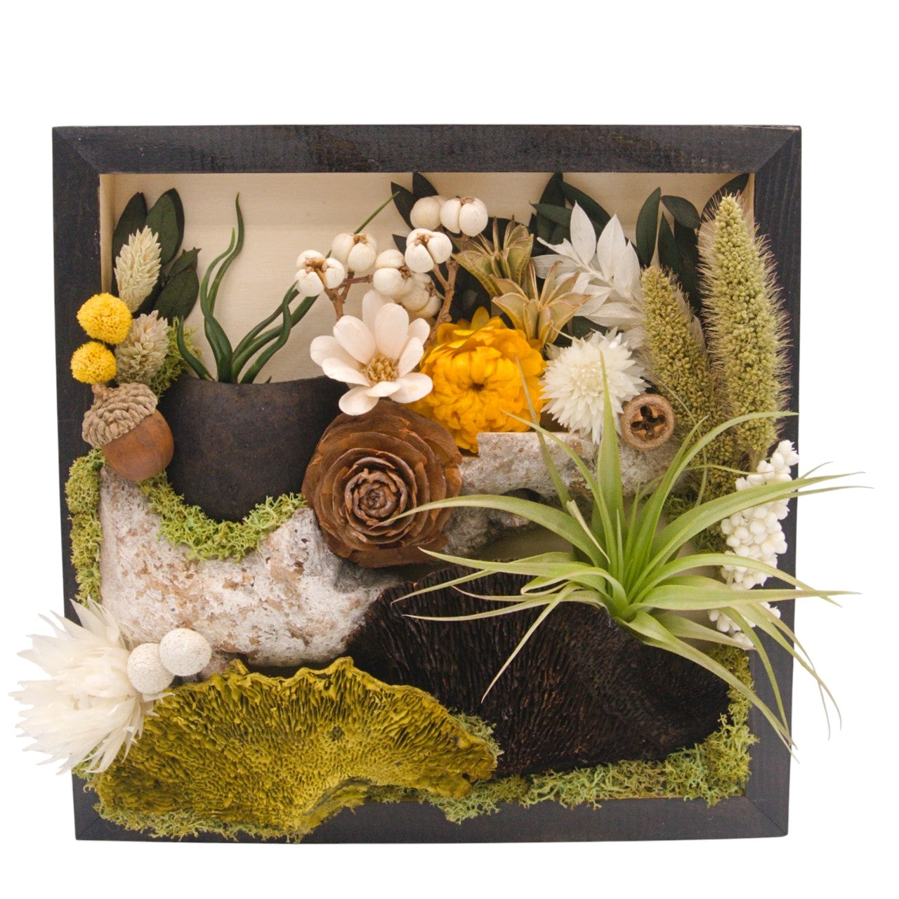 These frames are filled with dried and preserved florals, textured bark, and a living airplant that adds just the right touch of green. Each one is unique, like a tiny landscape frozen in time (except for the airplant — that one’s very much alive).