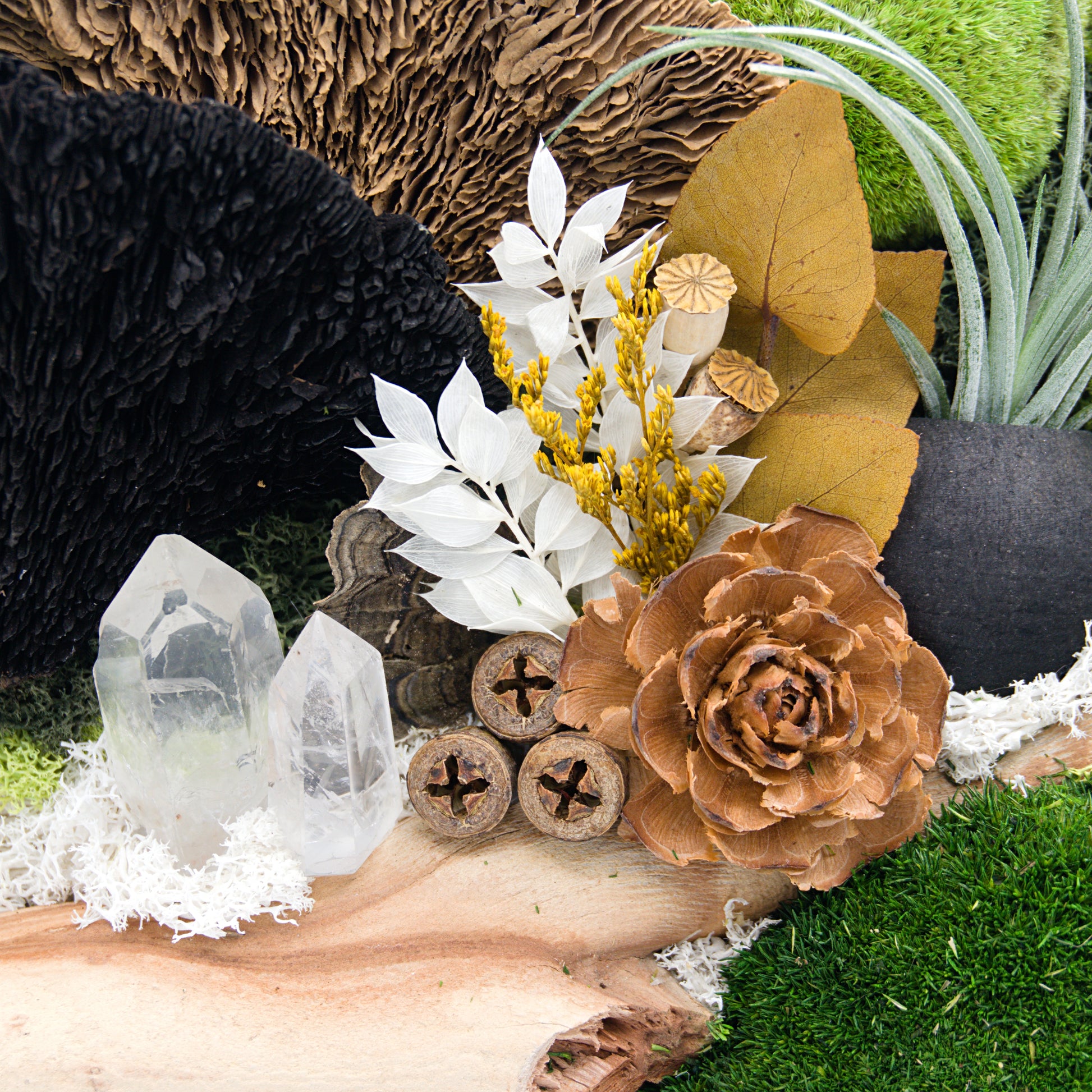 Add a piece of living art to your wall with this airplant frame. Each frame contains two or three live airplants surrounded by different types of moss, plus wood, bell seed pods, dried flowers, turkey tail mushrooms, and preserved sponge mushrooms.